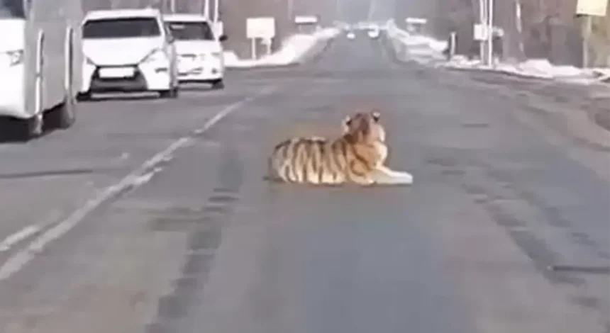 Na sred puta, potpuno ravnodušan prema svijetu oko sebe, odmarao je tigar.