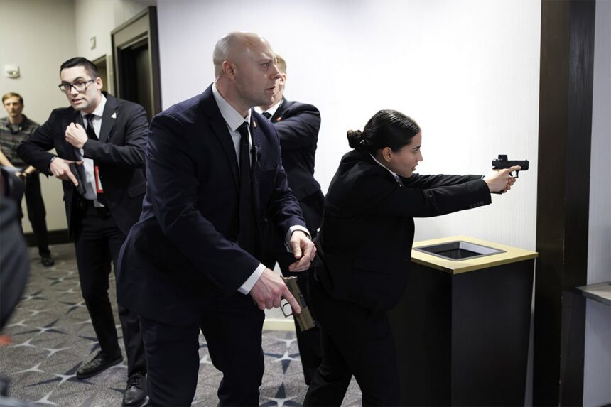Video captures loud noises that sounded like gunshots at the White House Correspondents’ Dinner. Shortly after, President Trump and the First Lady, along with other White House officials, were evacuated. Heavily armed Secret Service agents entered the venue and quickly escorted… pic.twitter.com/MFT3uusbca