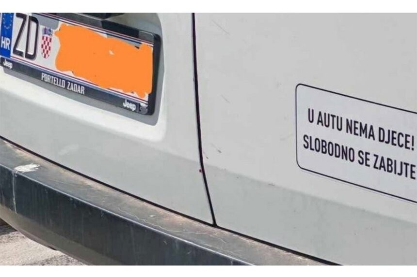 Naime, vozač je na desnoj zadnjoj strani vozila nalijepio tekst: “U autu nema djece! Slobodno se zabijte!”, aludirajući na naljepnice koje se mogu uobičajeno vidjeti na vozilima: “Beba u autu”, “Dijete u autu.”